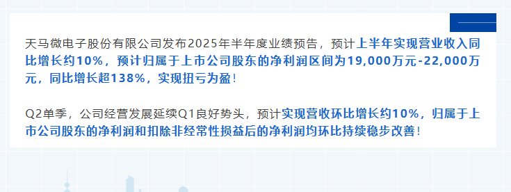 天馬微電子股份有限公司發(fā)布2025年半年度業(yè)績預(yù)告,預(yù)計上半年實現(xiàn)營業(yè)收入同比增長約10%,預(yù)計歸屬于上市公司股東的凈利潤區(qū)間為19,000萬元-22,000萬元,同比增長超138%,實現(xiàn)扭虧為盈!Q2